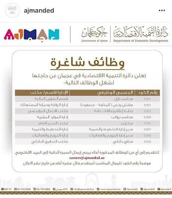 وظائف الامارات وظائف دائرة التنمية الاقتصادية بالامارات 22/2/2017 الاماراتى للتوظيف وظائف دائرة التنمية الاقتصادية بالامارات 22/2/2017 اعلنت دائرة التنمية الاقتصادية بحكومة عجمان بالامارات عن حاجتها لوظائف خالية تخصصات مختلفة التفاصيل بالاعلان التالي وظائف الامارات الاماراتى للتوظيف مقالات قد تهمك